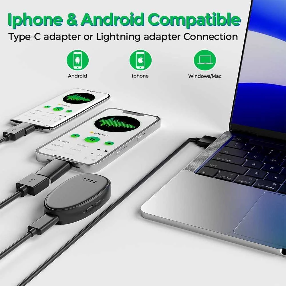 Compatible with iPhone, Android and PC: This audio recorder has both Lightning OTG adapter and Type-C OTG adapter that supports to compatible with all the smart Cell Phone and PC, which allows you freely and comfortably access and copy the recording files to you cell phone via the OTG adapters,meanwhile, this voice recoder also support you to connect with your PC via the USB cable,So that you can manager and share audio files documents intuitively. It bring you a fast and stable transmission environment, makes your work easier and more enjoyable,the recording device only broned for you.