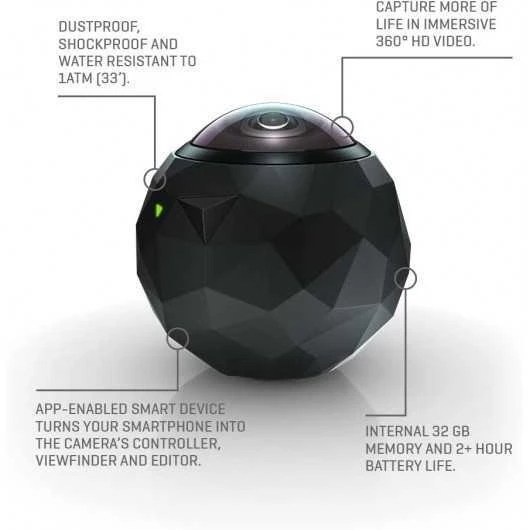 360fly 360° HD is a small ball-shaped camera that allows you to record videos in 360 degrees for a better immersion during your sports activities, vlogs or just family parties. It has an application that allows you to edit and share content directly on your social networks.