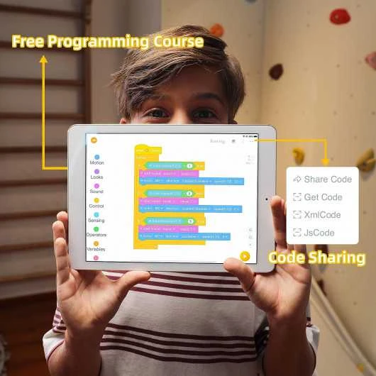 Robot Q has 233 bricks, 2 sensors, 2 motors, and a host controller that can be assembled into 20 robot toys. Free robot programming lessons include exciting programming and scientific knowledge, helping kids solve the puzzle of building robot while learning to code.