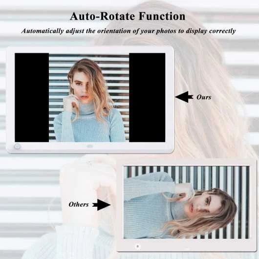 You can adjust the brightness of the screen and use the unique breakpoint play function. It will continue to play the photo, music or video you viewed the last time when you reopen the digital photo frame so you can continue to view your photos and videos from where you left. The digital frame will automatically correct the orientation of your photos to display them correctly and you can choose among the multiple modes. You can also choose transitions time and play them randomly or sequentially.