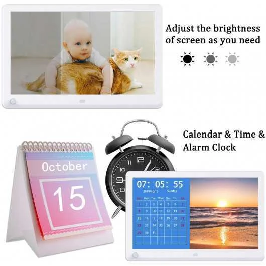 The remote control is a great tool to manage your device remotely and display the photos and videos that you want. It also has a wall mountable feature that allows you to put the frame on the wall as you wish. You can display your favorite moments exactly how you want them. The device is easy to use, you just have to plug and use it. You just need to insert a SD card/USB stick (up to 128 GB, not included) to instantly display your favourite photos and videos. You can delete the picture that you don’t want anymore directly on the frame. The device also has an alarm clock, time and calendar display.