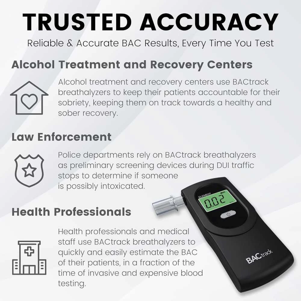 For 15 years, BACtrack has created accurate breathalyzers for consumers, businesses, schools, clinics, hospitals, the military, and law enforcement. Our customers trust us to offer the best in convenient, affordable, reliable blood-alcohol testing.