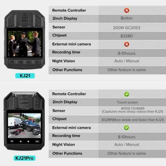 Boblov KJ21 Pro is a body camera with a remote control and HD1296P touchscreen. The sensor captures sharp videos during the day with no distortion and pixelate. The camera comes with a remote controller with an operation distance of 3-5meters. You can long press the “Photo” and ”Audio” button to pair and use easily. KJ21 Pro has a 2’’ touch screen that is intelligent and supports a 720p mini button external camera that is not included.