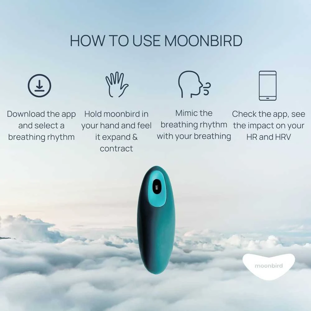 1. Download the Moonbird app and connect it to the device via Bluetooth. The device is compatible with iPhones iOS10.0 or higher and Android version 8.0.0 Oreo or higher. 2. Hold the Moonbird device in your hand. 3. Choose an exercise from the app and let the rhythm of the Moonbird guide your breathing. Inhale when it expands and exhale when it contracts. 4. The device will provide biofeedback, showing how your body is calming down due to your slowed breathing. 5. The app also tracks heart rhythm, heart rhythm variability, and coherence, offering various guided breathing exercises and meditations.