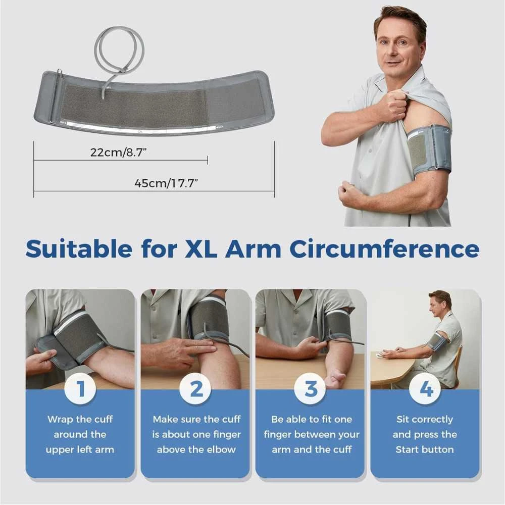 Adjustable XL Cuff – Our blood pressure machine has a wide-range D-ring cuff that fits 8.7”-17.7”(22-45cm) adult arm, suitable for XL arm circumference.