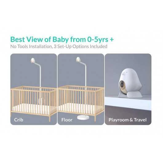 The device has dual camera support so you can switch between 2 or more cameras on the same account. It is secure with a 2-factor authentication and 256-Bit encryption which allows a family access sharing for up to 7 people. The monitor grows with your baby, each Cubo camera comes with 3 no-tool installation stands, a floor and crib stands plus a mobile stand perfect for the play room and travel. You can transform from baby cam to toddler cam with a simple switch of the stands.