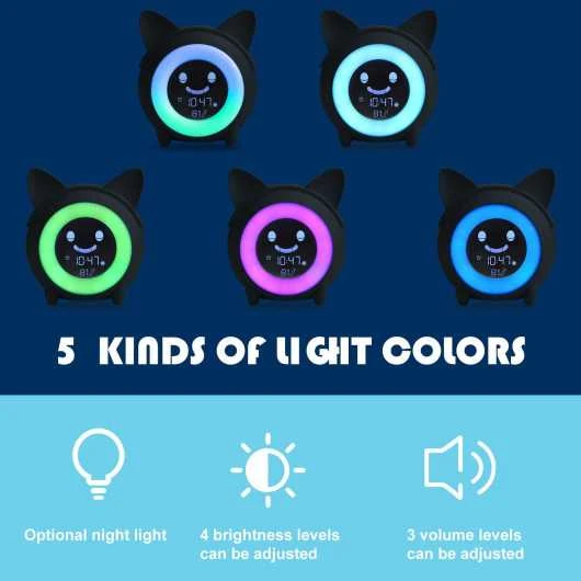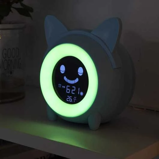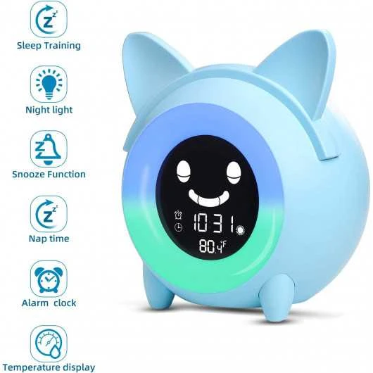 Wake up time and sleep time: Our sleep learning clock for kids uses fun facial expressions and gentle colors to teach your child when to go to sleep and when to get up. When the clock turns blue, children still have 30 minutes to go to bed, the background light gradually dims and the moon icon appears. When the clock turns yellow, there is a 30 minute countdown to get up until the backlight turns green, the alarm clock eyes will open and the sun icon will appear.