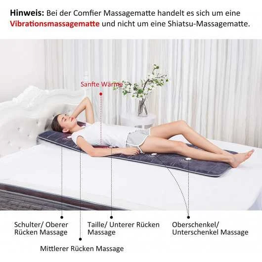 Soothing relaxation: the massage mat has a total of 10 vibration motors integrated to give you a comprehensive full body relaxation. By combining massage and heat, you get a higher efficiency of massage. You can relieve tension, pain and stress symptoms with this mat.