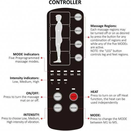10 Motor Massage Mat with 2 Heating Pads This massage mat has a variety of massage modes and heating pads to relieve stress and fatigue, making your whole body comfortable and relaxed. It allows you to select the specific massage area: shoulder, back, lumbar, legs or combine certain areas to better meet your needs.