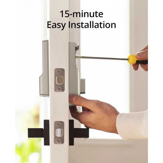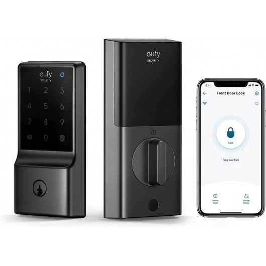The Eufy Security C210 Smart Deadbolt offers a seamless keyless entry experience with built-in Wi-Fi, eliminating the need for additional bridges. It provides 5 different access methods, including a touchscreen keypad, app control, physical key, Apple Watch compatibility, and voice commands via Alexa or Google Assistant. This lock ensures the highest level of security with BHMA certification and tamper-detection mechanisms, while also providing convenience through easy code management and remote access. Installation is simple, requiring just 15 minutes, and its sleek design fits perfectly on most doors. Stay informed with real-time notifications and event history, ensuring peace of mind. The durable battery lasts up to four months, and backup power is available via USB.