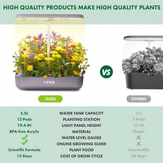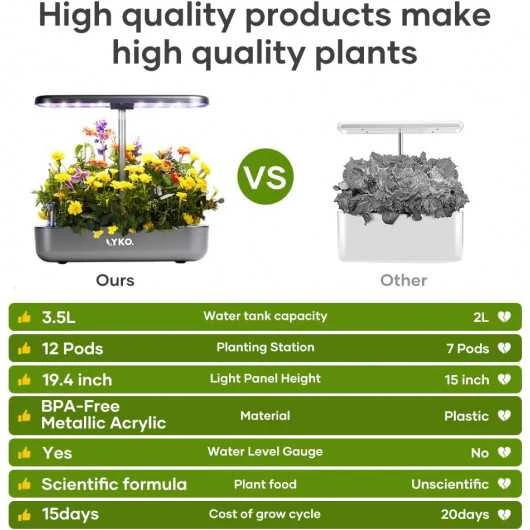 【Complete growing stater kit】At Lyko,we know the importance of keeping your indoor garden healthy and flourishing.That’s why our kit comes with everything you need to ensure an ideal environment for your herbs.With 12 grow baskets,12 grow domes,12 grow sponges,nutrients,tags and rods to help your herbs grow strong and bountiful throughout the seasons.Lyko strives to provide the highest level of customer satisfaction.Please contact us if you have any questions.