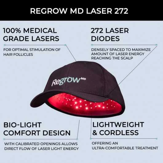 WHAT’S INSIDE: RegrowMD Laser Cap 272; Sports Cap; Rechargeable Battery; Charging Cable; Power Cord