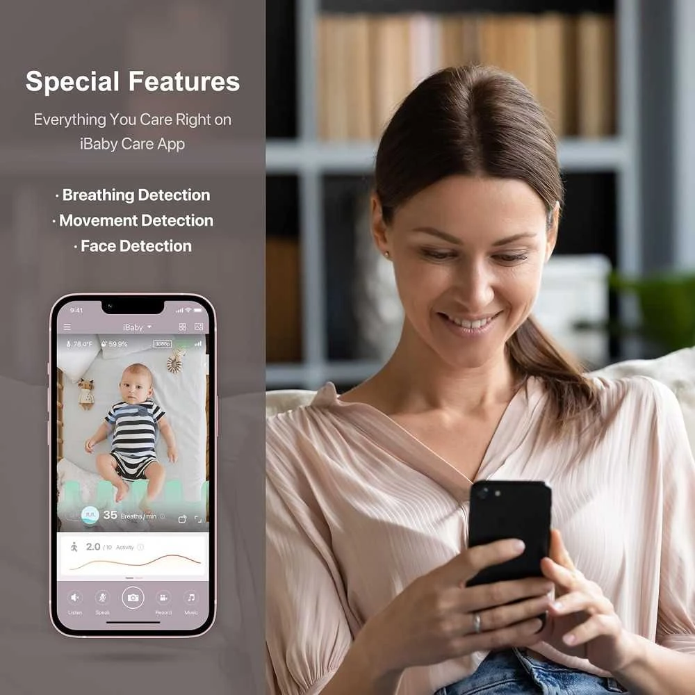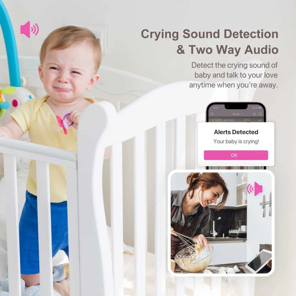 Intelligent Monitoring: Smart baby monitor provides all-round care. You can receive timely alerts on your smartphone including breathing/ movement/ sound/ temperature and humidity/ face covering/ turning over.