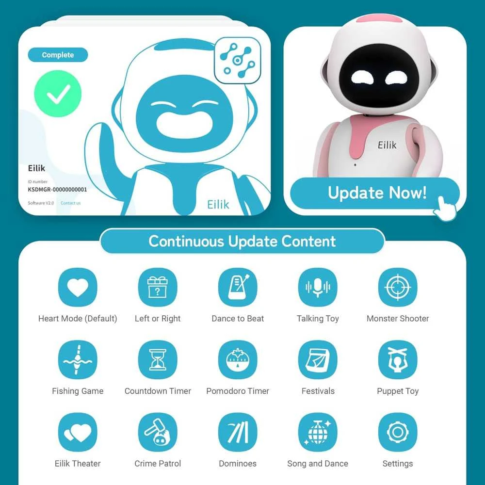 CONSTANTLY UPGRADING AND ADAPTING – With frequent firmware updates and new interactive content added, Eilik will constantly learn more emotions, functions, and games, it will keep him entertained all the time!