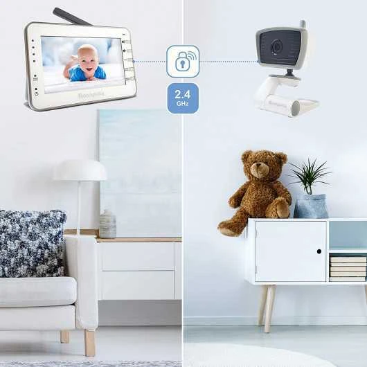 Thanks to the parent unit, you can make the camera pan, tilt and zoom remotely to make sure to be aware of what your children are doing, no matter where they are. The device makes sure the connection between the camera and the monitor is private and secure so that your private moments are kept safe. You don’t need an internet connection as the 2.4Ghz interference-free signal works anywhere in the home. Thanks to the talk back button, you can communicate with your baby or your partner without having to go in the room.