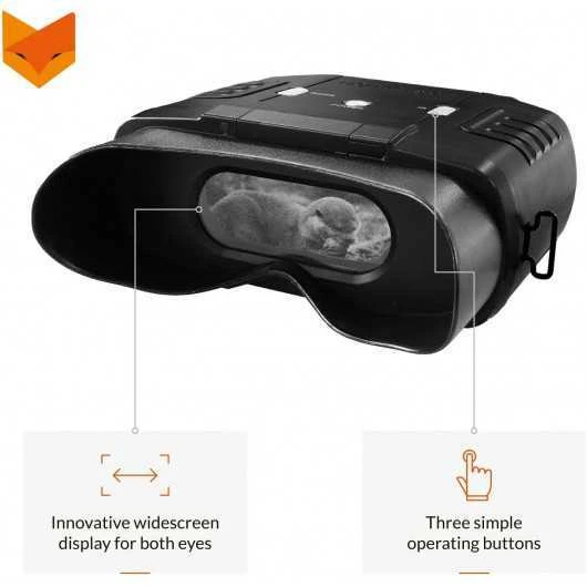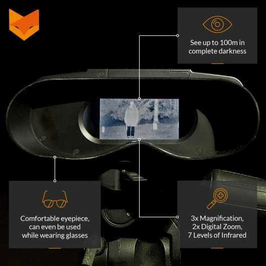 The Nightfox offers high image quality and daylight clear night vision thanks to highly sensitive sensors. It offers a very large screen that instantly displays what the sensors see and can accommodate both eyes directly even when used with glasses. It has an integrated infrared that offers up to 100 meters of visibility in total darkness with a zoom magnification X3 and a digital zoom X6.