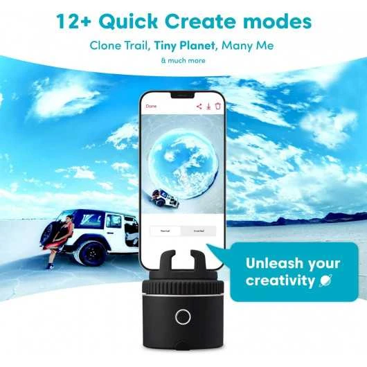Pivo Pod Silver is an automatic motion and face tracking device that is twice as fast as Pivo Pod Red. It has a remote control that allows you to easily control it and an app that offers up to several creative effects for your social networks.