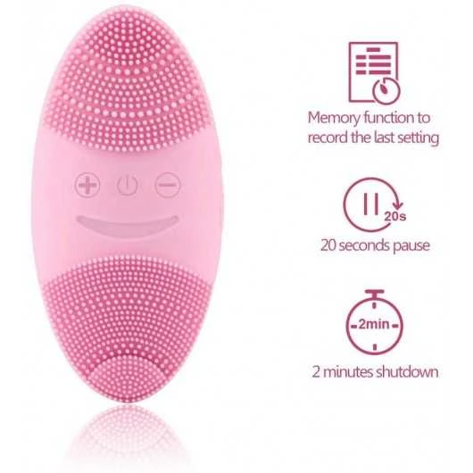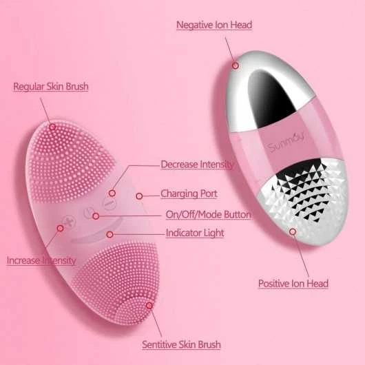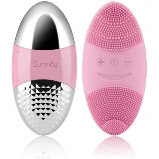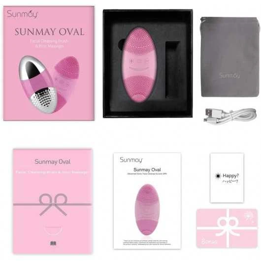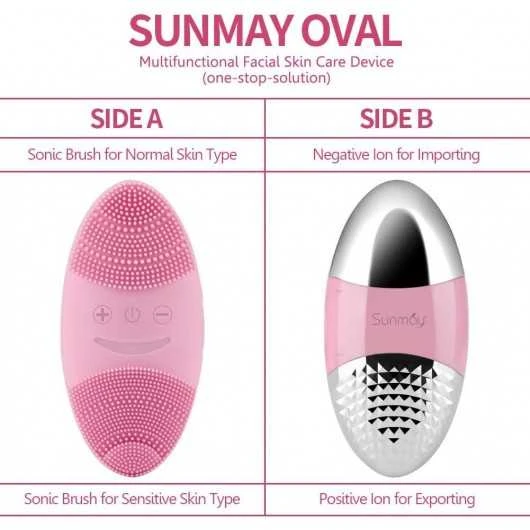 The SUNMAY Oval is made up of four different parts with two parts for each side to thoroughly clean your facial skin. It has a vibration function with 8 adjustable intensity levels to adjust to your needs. One side of the device has different sized brushes that serve as exfoliators for normal and sensitive skin. The other side of the device has a smooth silver negative ion part and a diamond positive ion pattern part. It uses sound vibrations up to 12,000 times per minute with an automatic shut-off function after 2 minutes of use.