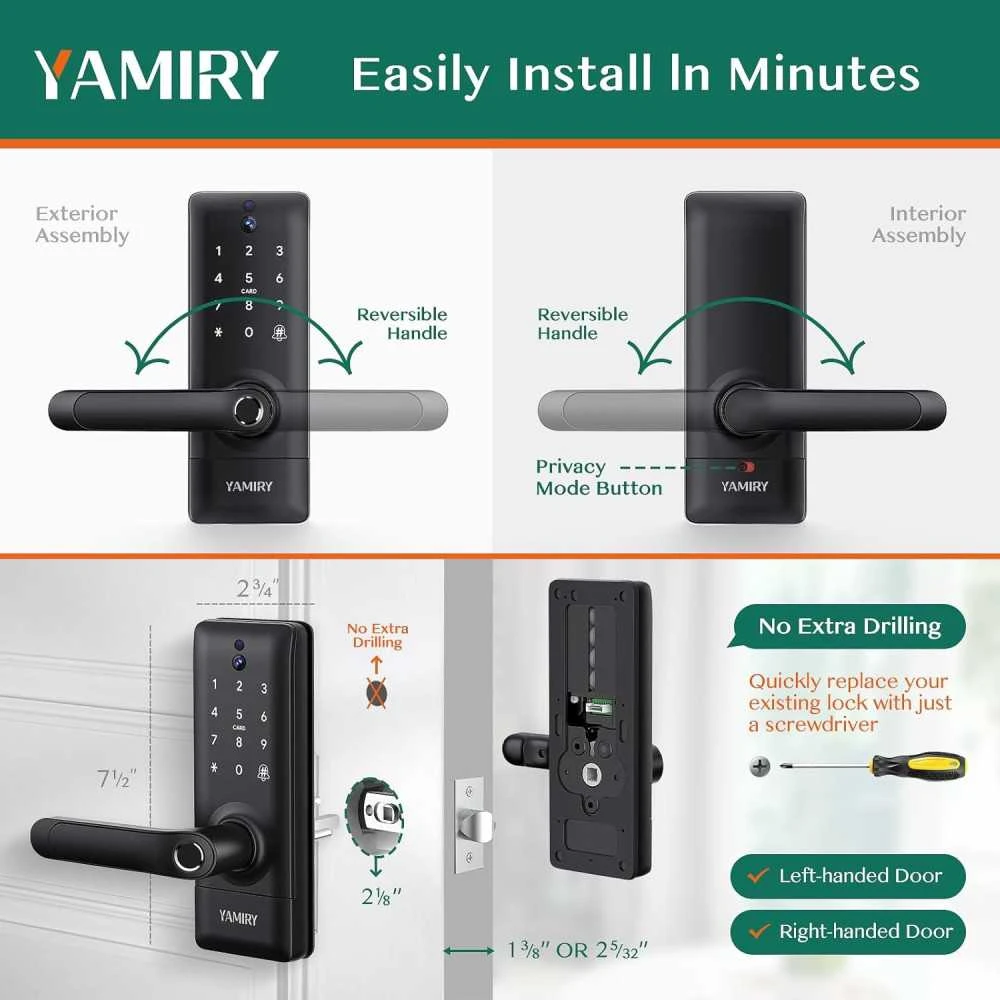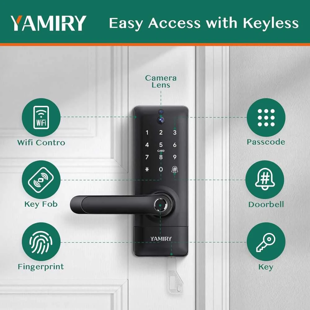 Built-in WiFi: YAMIRY smart locks for front door allows you to connect directly to your Wifi network without a third party hub, panel or subscription. You can share access and manage settings of the lock via the App. Create multiple access codes to for your family, friends, visitors, or guests. Receive real-time notifications for ultimate control (Note: Only support 2.4GHz Connectivity).