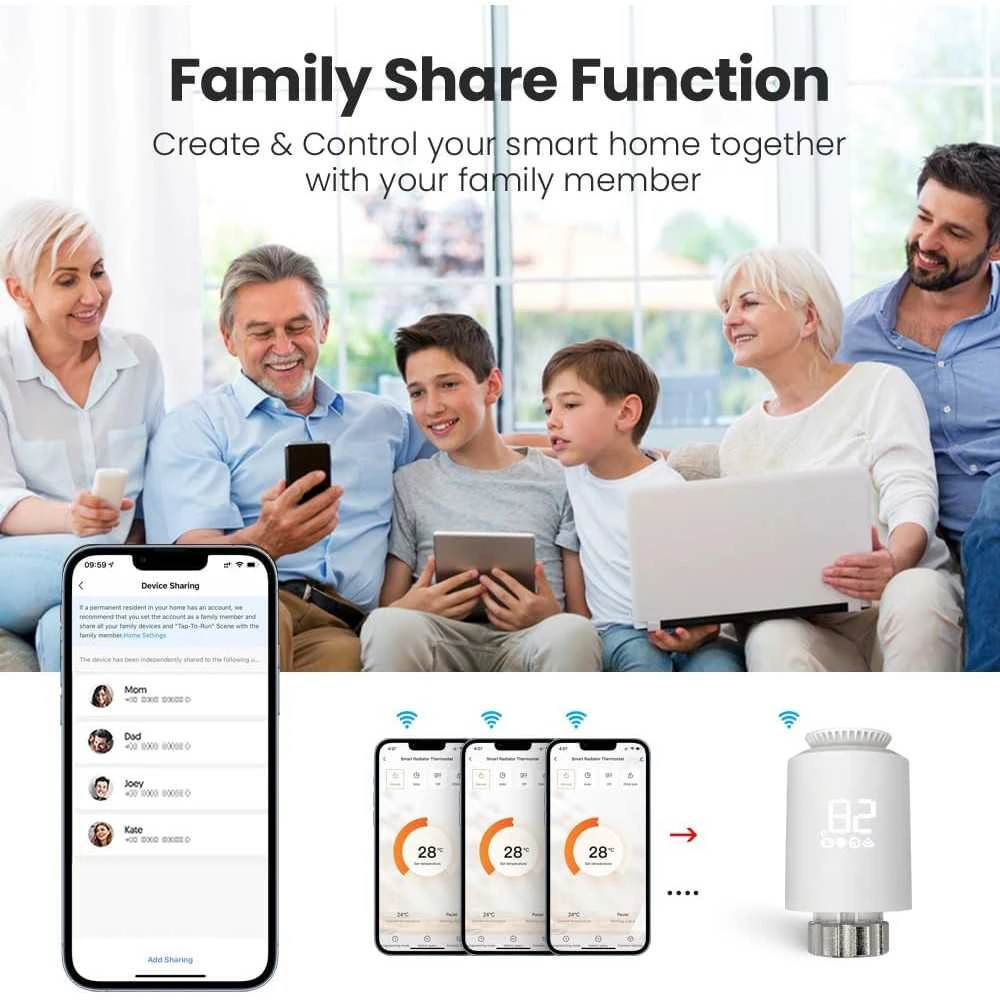 【Family Sharing Function】 – Smart WiFi connection for thermostatic radiator head, you can share the limited privileges of TRV with your family, build a smart home with your family.