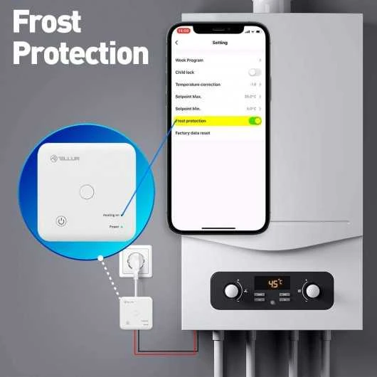 Tellur WiFi Thermostat is a set of 3.7 inch monitor and transmitter that allow you to control your heating system manually or directly via your phone. They are compatible with Alexa and Google assistant voice command to make it easy for you to control it.