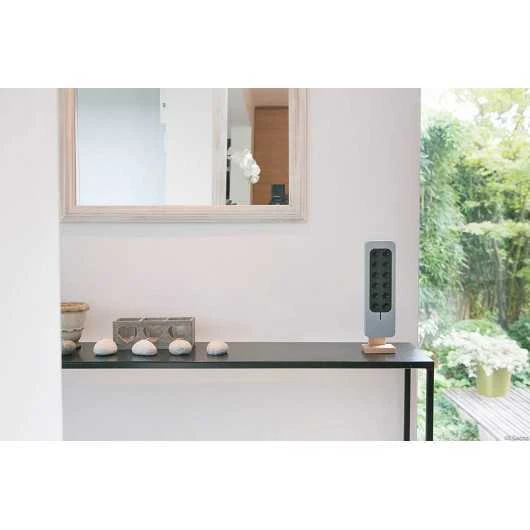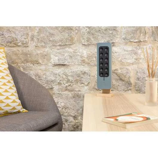 It is a portable device with a modern design that blends perfectly with the environment of your room where it is placed. It has a wooden base and draws power directly from your power outlets, making it ideal for taking with you wherever you go, whether at home, in the office or on the road.