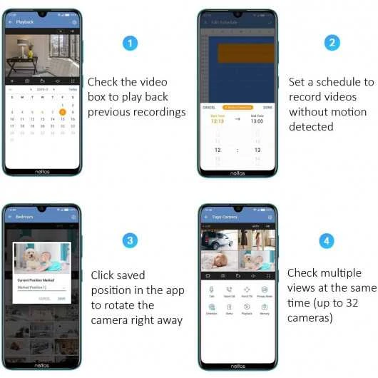The camera is equipped with a motion detection function, which notifies you instantly when motion is detected and warns the authorities in case of theft or intrusion. It is equipped with a security alarm that can be switched on and emits sound and light effects to scare off unwanted visitors. The device has a built-in microphone and speaker that provides smooth and clear two-way audio no matter where you are on your smartphone. It has a compatible app on Android and IOS devices that supports up to 32 cameras on a single device and displays 4 cameras on a single screen. It is compatible with Google Assistant and Amazon Alexa for voice control.