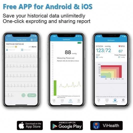 ViATOM Armfit Plus is an ideal device for accurately knowing your blood pressure and electrocardiogram through built-in sensors with advanced medical measurement technology. It has an LCD screen and has an app that is compatible on Android and IOS devices and makes it easy to read all measured data.