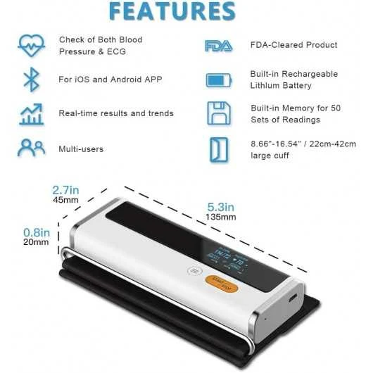 It is a device that easily fits in your bag or pocket and has a sturdy design that is shock resistant. It uses Bluetooth connectivity and has an LCD screen that displays your last reading next to your current reading. It has 2 control buttons and a built-in memory can store 10 sets of ECG waveforms and 50 sets of blood pressure data, allowing it to work independently without a smartphone.