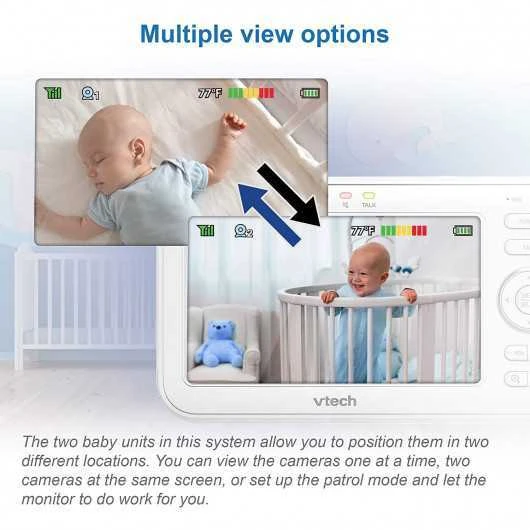 The automatic infrared night vision gives you a clear view of the nursery even with the lights out, so you can check in without disturbing your little one. You can also comfort your infant from any room with the built-in intercom on the portable parent unit. The two baby units in this system allow you to position them in two different locations. You can view the cameras one at a time, two cameras at the same screen, or set up the patrol mode and let the monitor do work for you. The device has a range up to 300m to always stay in touch with your baby from another room.