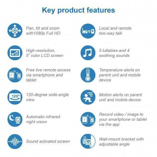 You can with the monitor walk around any room in the house while connected to your baby using wifi connectivity. It allows you to see what’s going on in your baby’s room with 720p image quality. This is the perfect device for home monitoring, for wider monitoring, VTech offers an app that is compatible on iOS or Android and offers 1080p Full HD streaming. On both monitoring modes, you can be alerted to movement, temperature or put your baby to sleep with 5 lullabies and 4 sets of ambient sounds including white noise and trickle.
