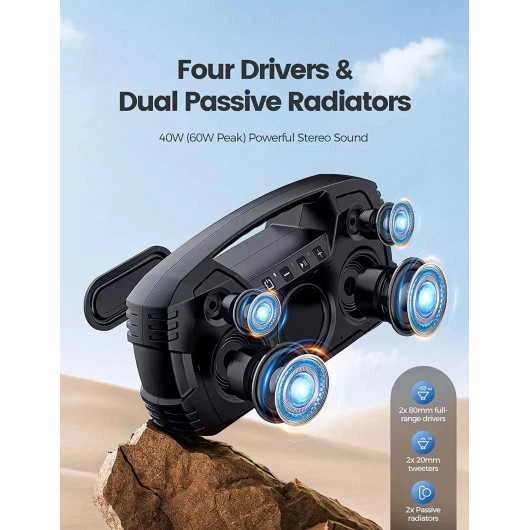 Powerful Stereo Speaker – Featuring 4 dedicated drivers with 2 15W full-range drivers and 2 5W tweeters, along with 2 passive radiators on the front and rear, this loud Bluetooth speaker delivers 40W surround sound (peak 60W) and pumps out well-balanced midrange, crisp treble, and punchy bass with virtually no distortion, letting you enjoy the music to the utmost. Pair 2 speakers together for 80 watt stereo sound.