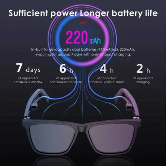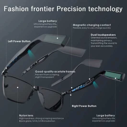 The glasses have frames made of cellulose acetate sheet with a nose pad designed to fit comfortably for both men and women, the lenses are polarized nylon with UV 400 and UV300 protection, they have an IP67 rating resistant to dust, water splashes or sweat and easy to use thanks to the control buttons located on the arms of the glasses.