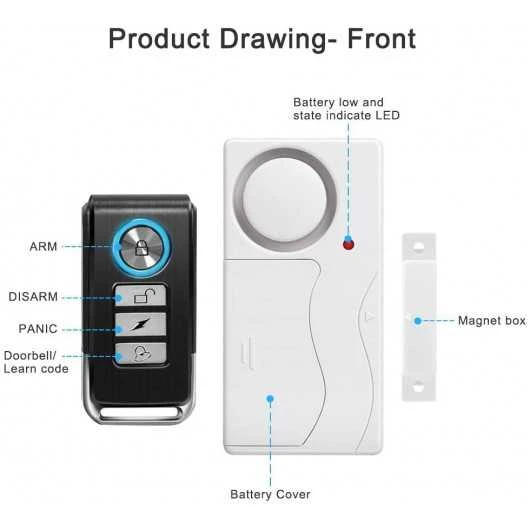 - Product size: Alarm( 3.35*1.57*0.59 inch), Remote( 2.48*1.18 inch), Magnet box(1.77*0.47 inch)