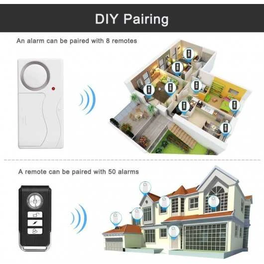 Wsdcam Door Alarm Wireless Remote Control Anti-Theft Door And Window Security Alarms Sensor for Do-It-Yourself Home Security System. Many burglaries occur from break-ins through doors/ windows, especially side, rear and garage doors. This door security devices with 105 dB loud alarm sound can help to deter the intruder, wake or alert you if at home and possibly alert neighbors. The wireless door alarm have 4 modes— Arm/Disarm/Panic/Doorbell mode controlled by the remote, wireless control range up to 49 ft. Not only a DIY door and window alarm, but also a door open chime/ pool alarm for kids safety or helps notify you if kids/ pets or visitors coming/ going, and emergency alert system for the older/ patients.