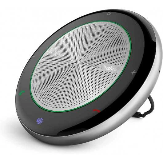 It is a small circular shaped device with a modern design that blends perfectly with your desk, conference table thanks to an adjustable stand that is located at the back. It has 6 touch-sensitive buttons that allow you to turn it on or off, pick up or hang up a call, increase or decrease the volume and activate the sound. It’s made of sturdy materials and can easily fit in your bag so you can take it with you anywhere. It has a 1420 mAh battery that can be recharged via its USB-C port but offers 9 hours of voice communication. It has a zippered bag that helps protect it from dust and makes it easy to move around.